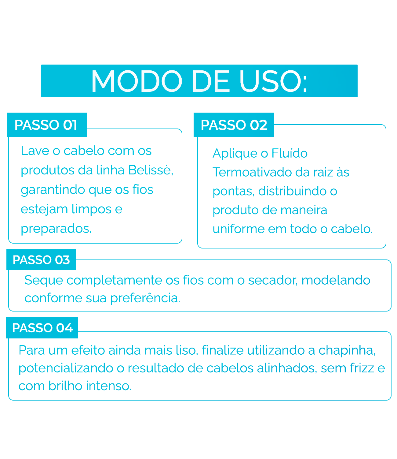 O Fluído Termoativado Belissè proporciona fios alinhados, com brilho intenso e toque macio, sem alterar a estrutura natural do cabelo. Desenvolvido para quem busca praticidade no dia a dia, ele reduz o tempo de secagem e protege contra danos térmicos, garantindo um efeito liso de salão em casa.