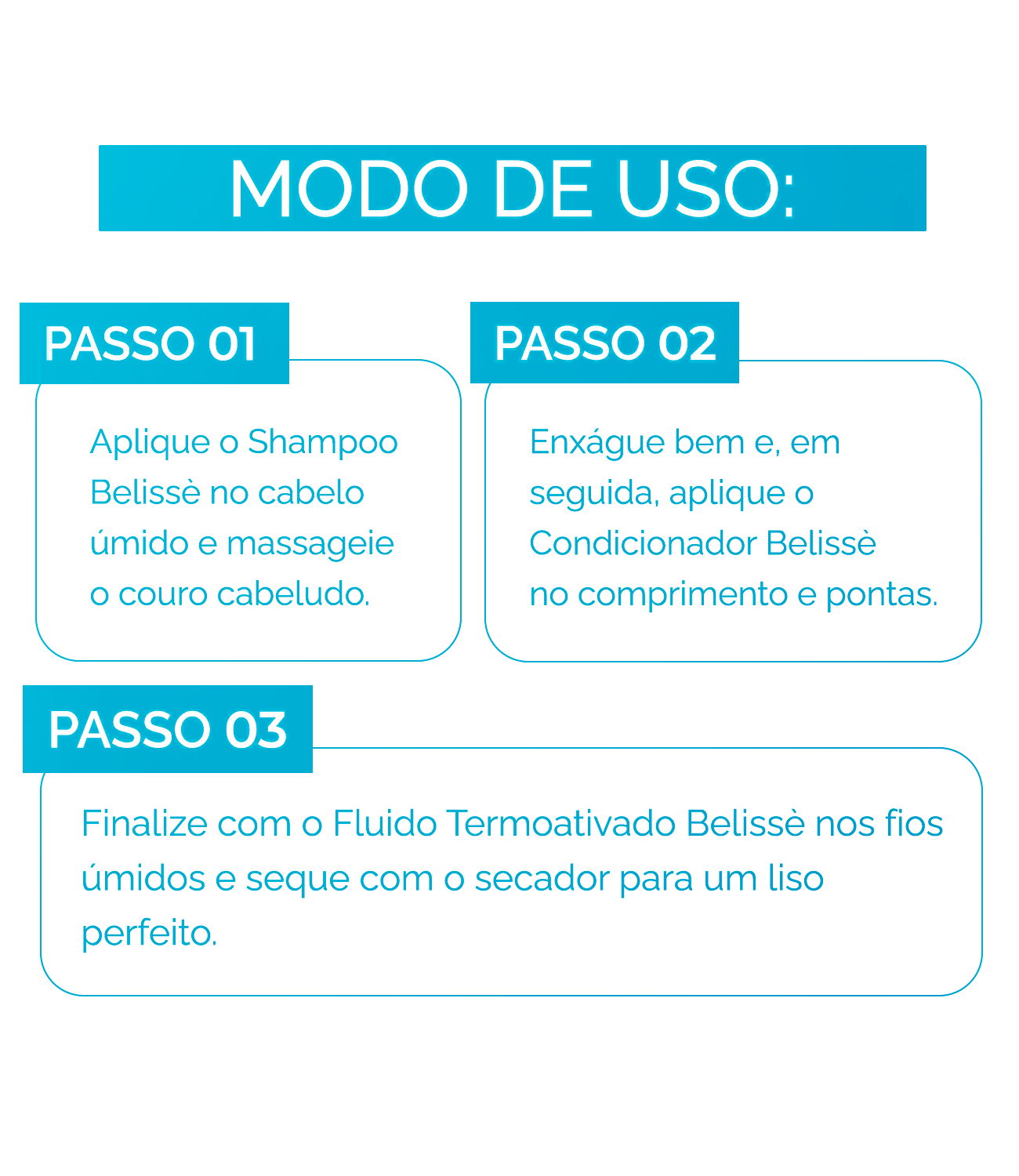 - Finalize com o Fluido Termoativado Belissè nos fios úmidos e seque com o secador para um liso perfeito.