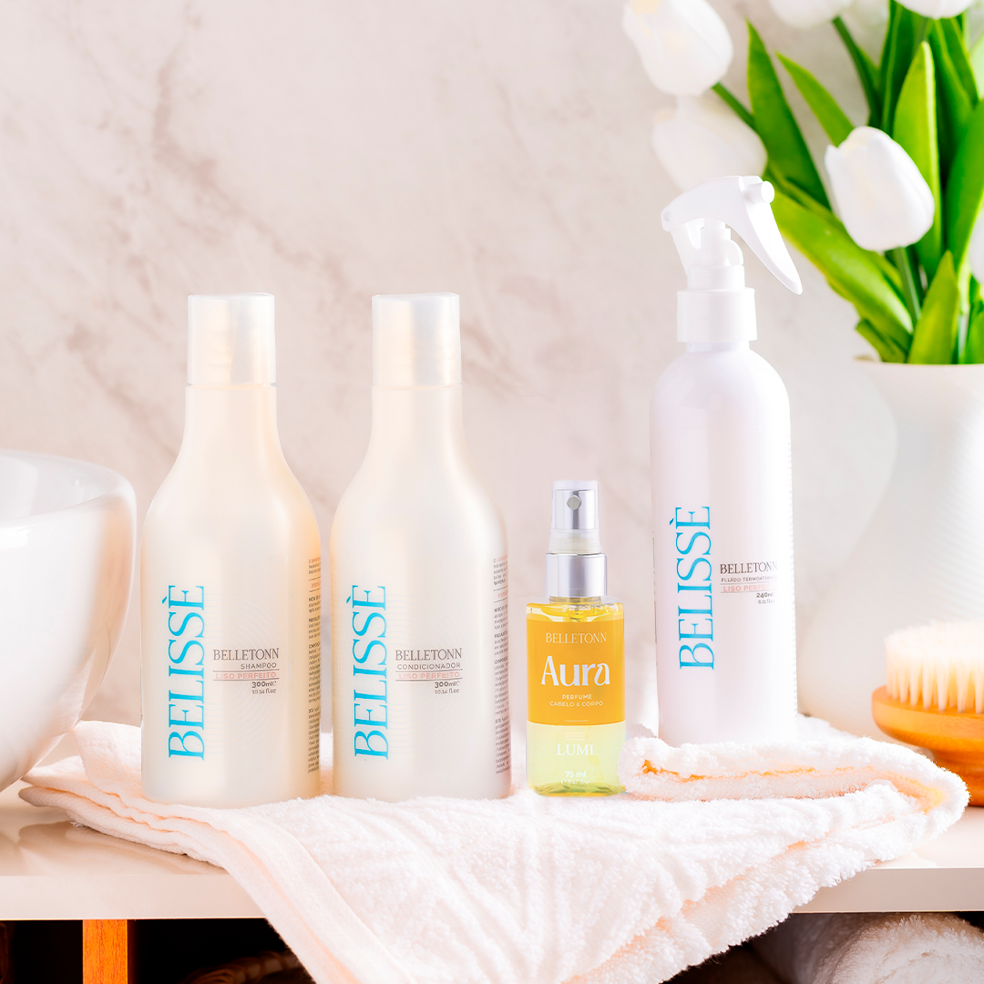 E para completar essa rotina, o perfume capilar Aura Belissè acompanha o kit com uma fragrância sofisticada e envolvente, ideal para cabelo e corpo.