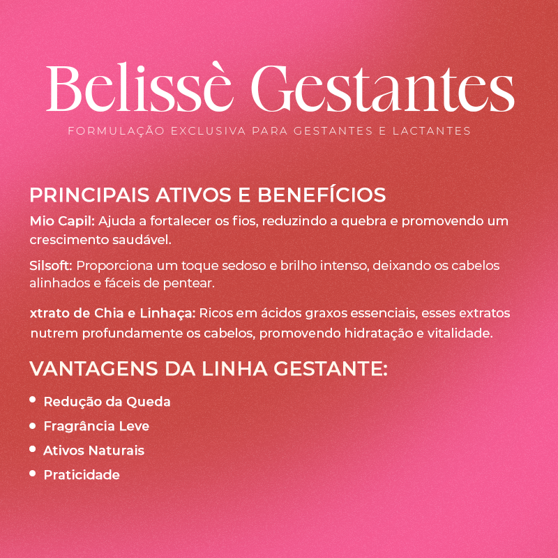 A Linha Belissè Gestantes foi desenvolvida especialmente para atender às necessidades dos cabelos nesse momento único da vida. Com uma fórmula segura, clinicamente e dermatologicamente testada, esta linha é perfeita para ajudar a reduzir a queda e a oleosidade, proporcionando cabelos lisos e saudáveis.