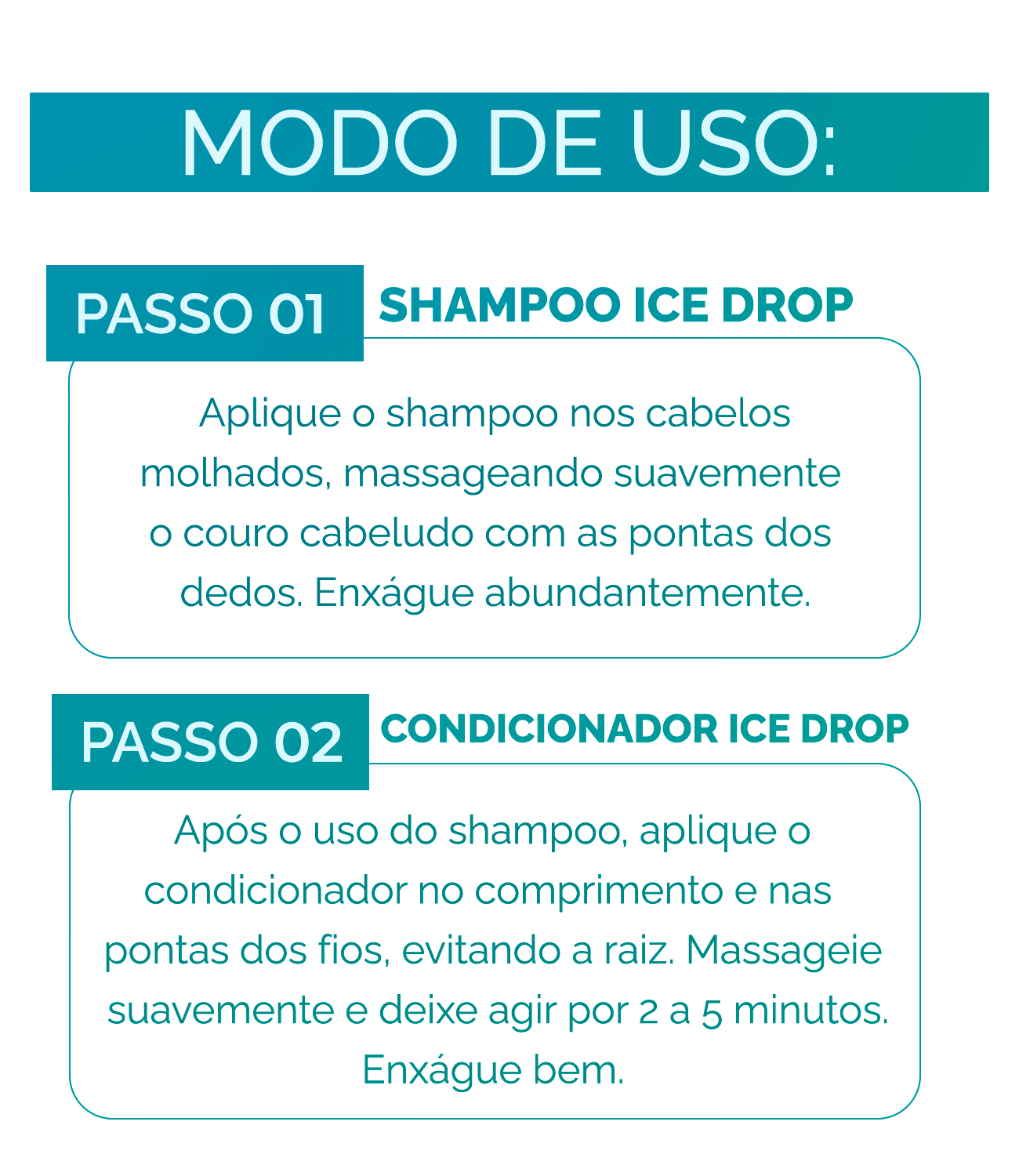 Revitalize seus cabelos com a linha Ice Drop, a solução perfeita para raízes oleosas e pontas ressecadas. Sinta-se leve, fresca e com cabelos alinhados, macios e saudáveis, como se tivesse acabado de sair do salão!